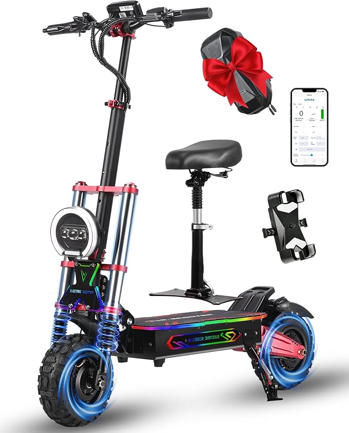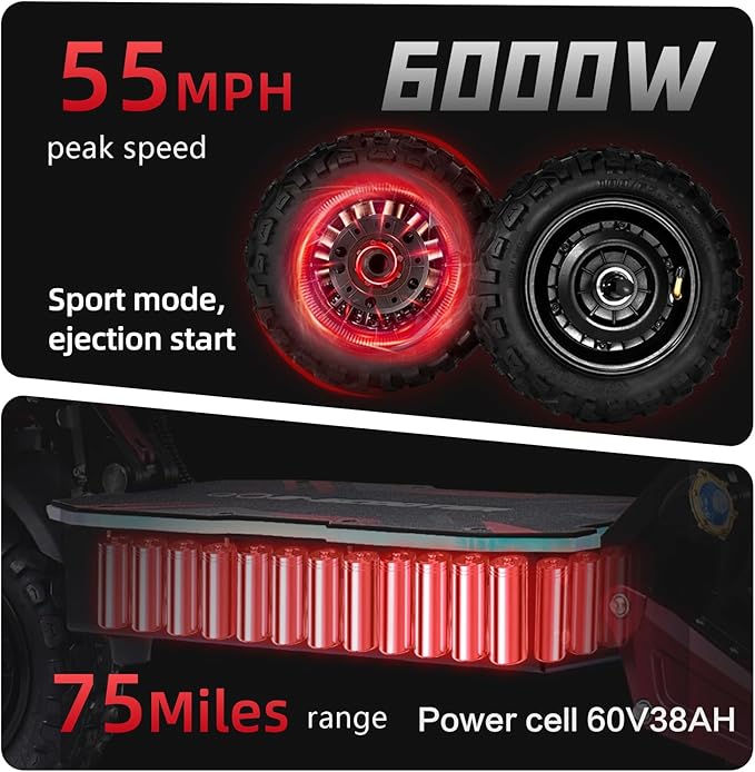 • 【55MPH & 6000W Powerful Brushless Motor 】The S5 38Ah adults electric scooter can conquer any terrain, which features dual 3000W brushless motors (6000W total!), High torque, Climbing 45° steep hills effortlessly and reaching 85 km/h (55MPH). Tackle snow, sand, rocks, and more—ride anywhere, anytime. Unleash adventure with unstoppable power!Perfect for thrill-seekers, commuters, and off-road adventurers!