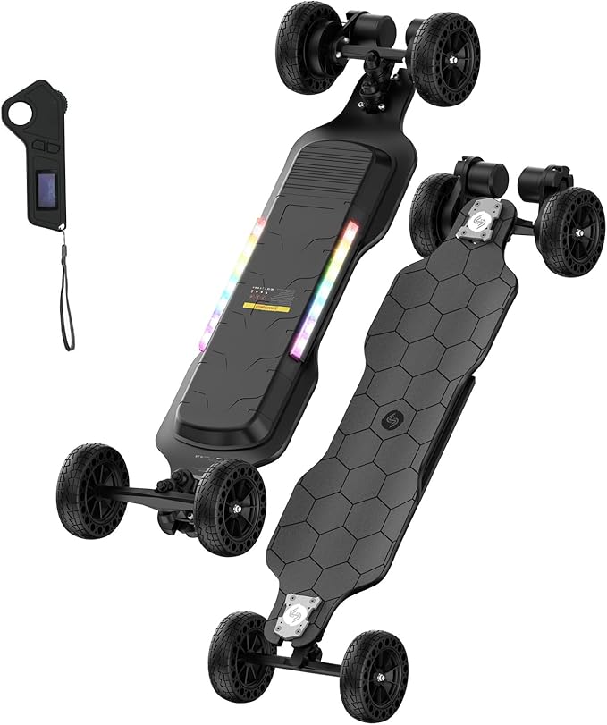 - Safer rides day and night: Safety is paramount with our Off-Road board. An advanced electronic control system and an ergonomic handheld remote put all controls at your fingertips, displaying real-time speed, battery life, and mode settings. The integrated LED lighting system enhances visibility during night rides, with customizable options that range from dynamic strobes to subtle fades—ensuring you’re seen and stylish wherever you go