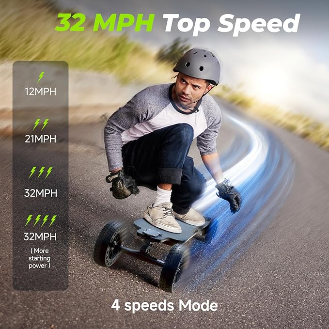 - Break boundaries with unprecedented speed: This electric skateboard redefines what’s possible in the world of electric skateboards, propelling riders to speeds up to an exhilarating 32 mph (52 km/h). Designed for adrenaline junkies and serious commuters alike, its powerful motor delivers lightning-fast acceleration, taking you from 0 to 32 mph in mere seconds. With four adjustable speed modes, the V10 caters to riders of all skill levels, making every journey unforgettable